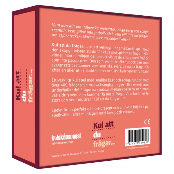 Godt at du spørger er et super spændende spørgsmålsspil, hvor du får lov til at bestemme din modstanders spørgsmål! Vælg et spørgsmål, som du tror, din modstander ikke kan svare på. Hvis han svarer forkert, taber han, men hvis han svarer rigtigt, får han lov til at bestemme, hvem der skal have det næste svære spørgsmål. Et rigtig sjovt selskabsspil, der passer perfekt til fester, spændende spilaftener, en sjov middag og andre festlige lejligheder.