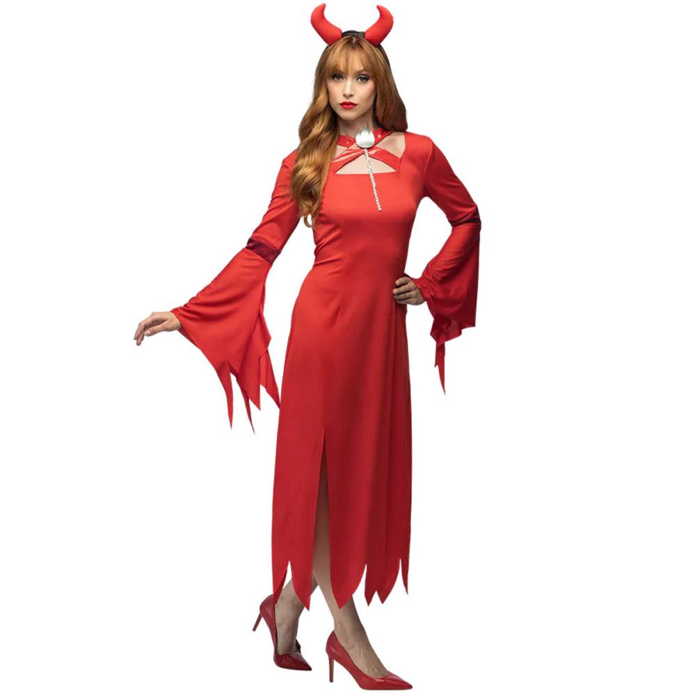 Lady Lucifer Kostume omfatter et kostume inspireret af Lady Lucifer med et rødt diadem med djævlehorn samt en rød takket kjole med lange udsvajede og takkede ærmer.