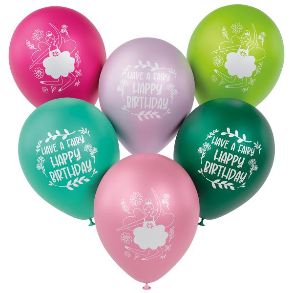 Latexballoner Fabulous Fairy 6-pak omfatter seks balloner i forskellige matte farver, hvor hver ballon er prydet med et hvidt motiv af blomster og enten teksten "Have A Fairy Happy Birthday" eller en ballerinafe.