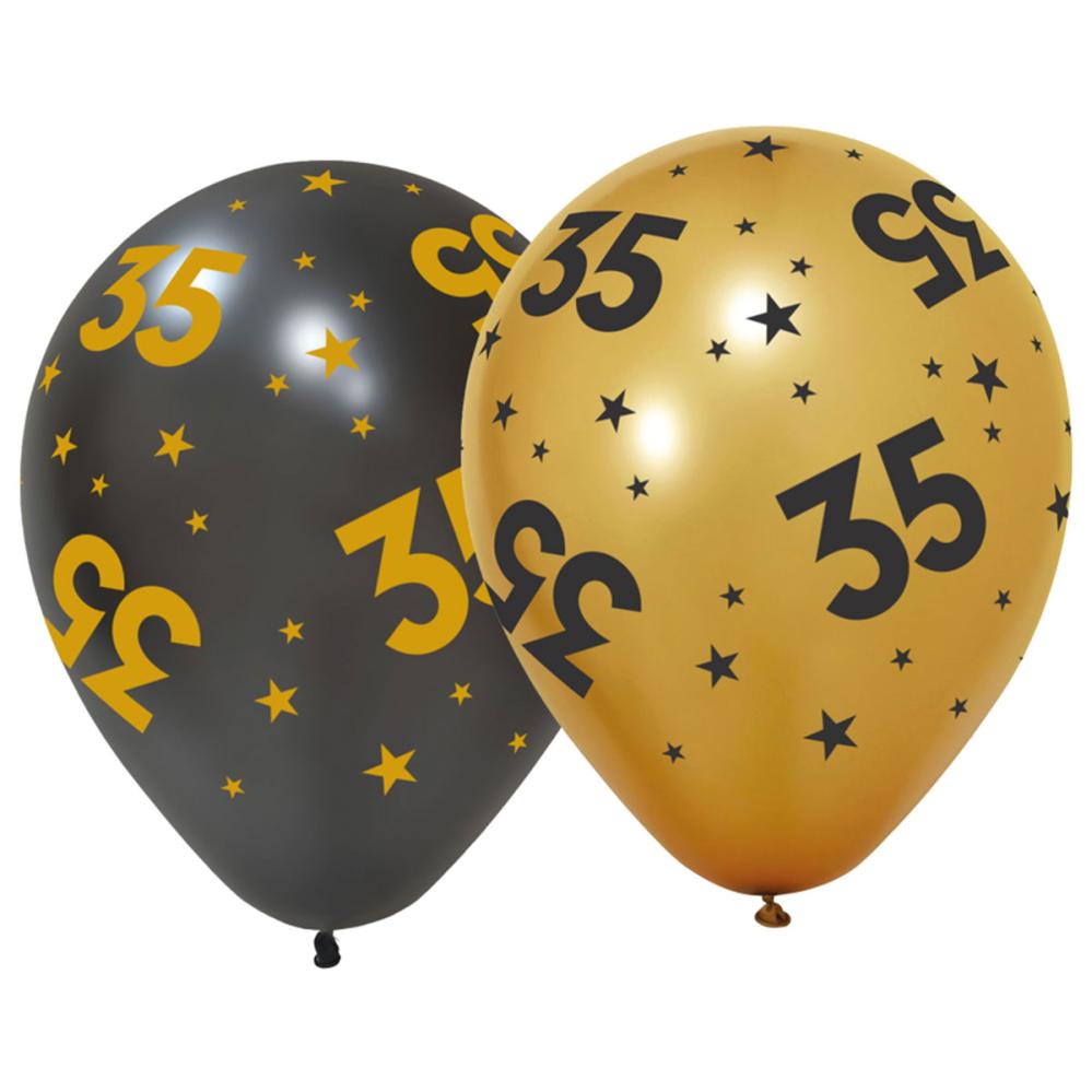 Latexballoner med Stjerner & Tallet 35 6-pak indeholder seks latexballoner, hvoraf tre har stjerner og tallet "35" i sort på guldfarvet baggrund og de andre tre har samme motiv i omvendte farver.