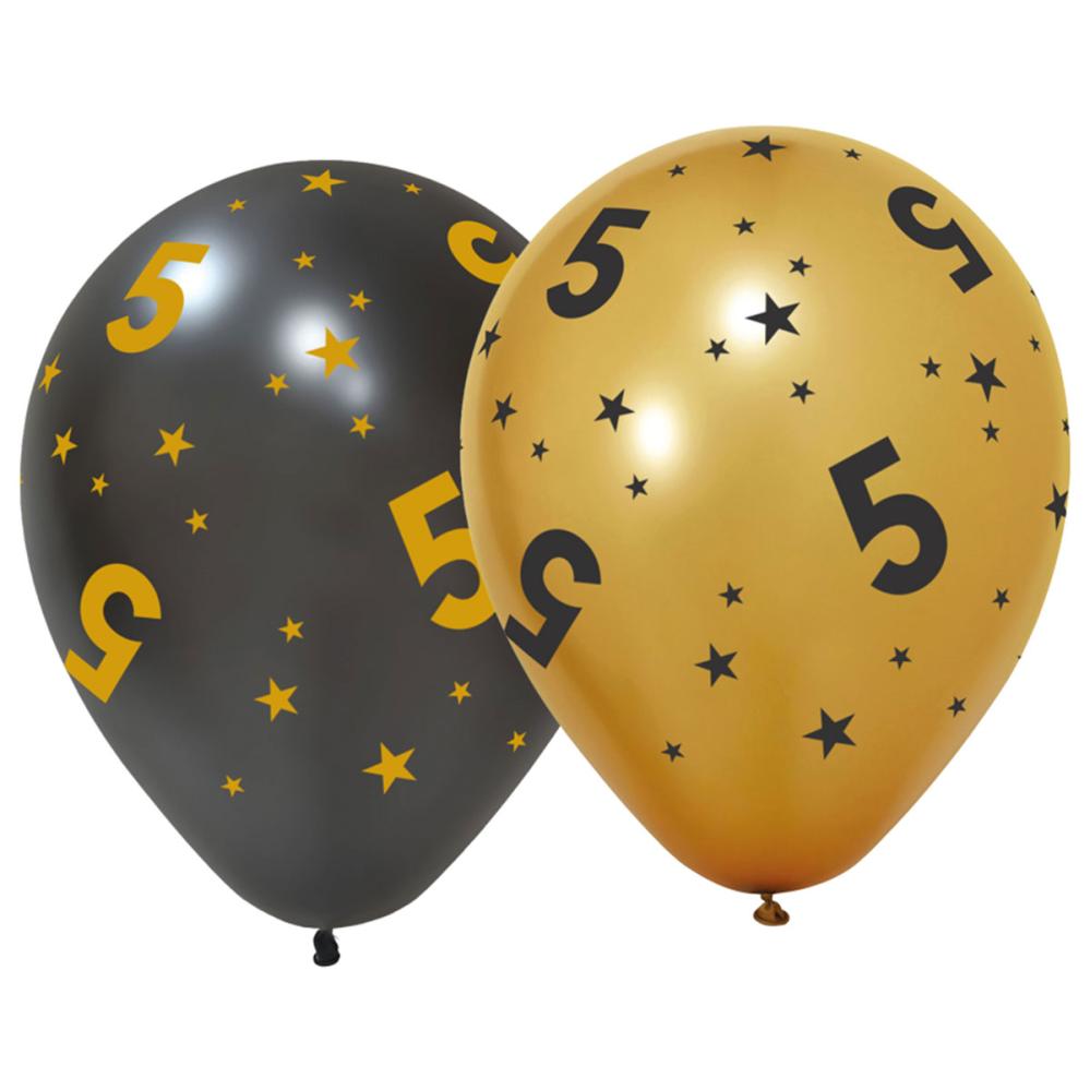 Latexballoner med Stjerner & Tallet 5 6-pak indeholder seks latexballoner, hvoraf tre har stjerner og tallet "5" i sort på guldfarvet baggrund, og de tre andre har samme motiv i omvendte farver.