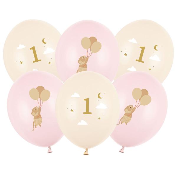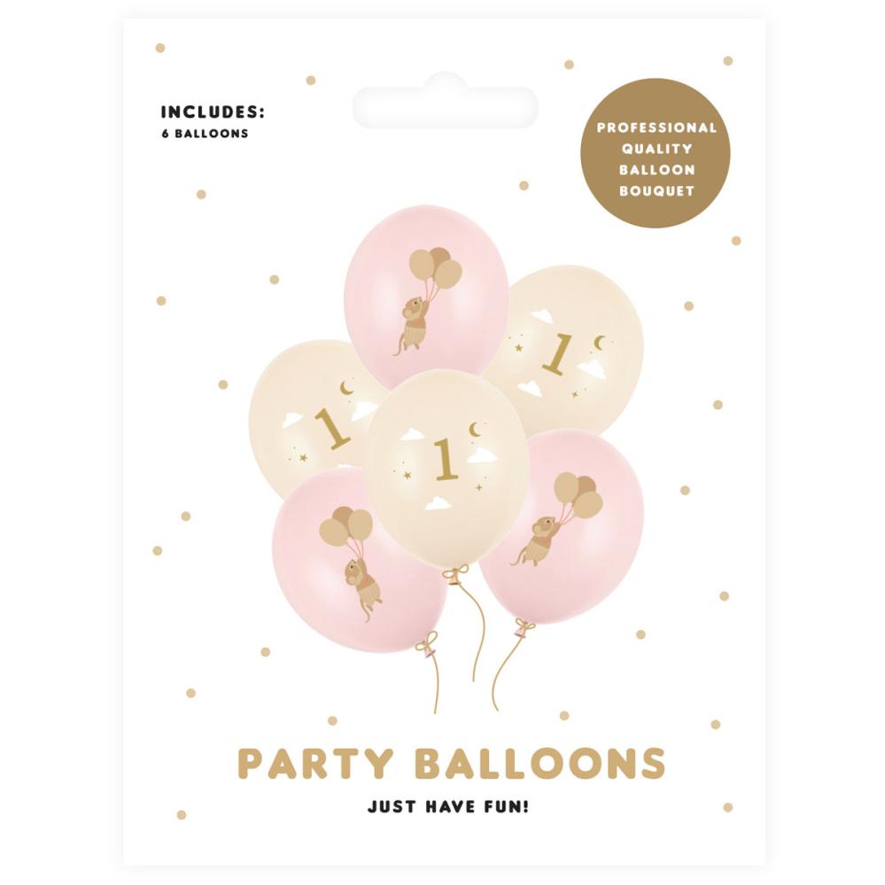 Latexballoner Mus 1 år Lyserød/Fersken 30 cm indeholder latexballoner, hvor halvdelen er lyserøde og har 3D trykte mus, som svæver med deres egne balloner, mens den anden halvdel er lysfersken og har 3D trykte motiver af tallet et i gråt, hvide skyer og grå stjerner.