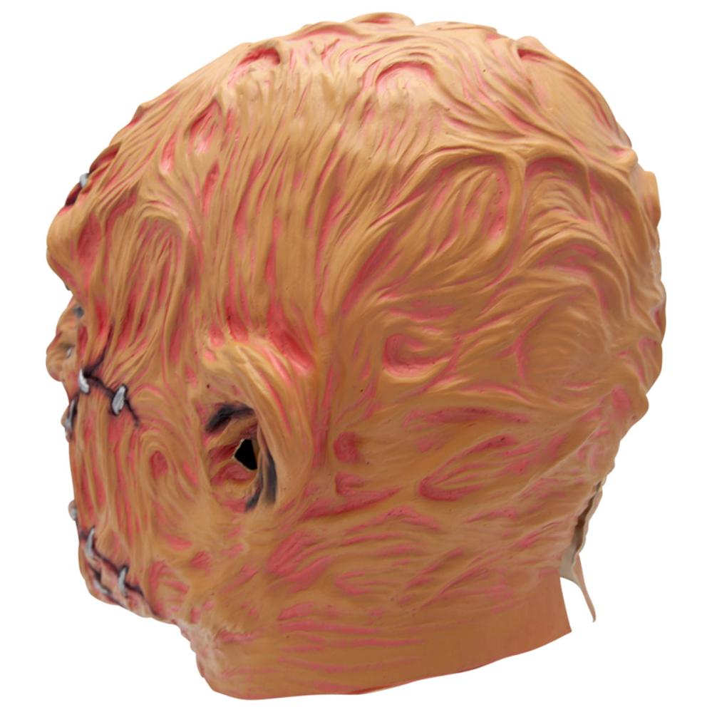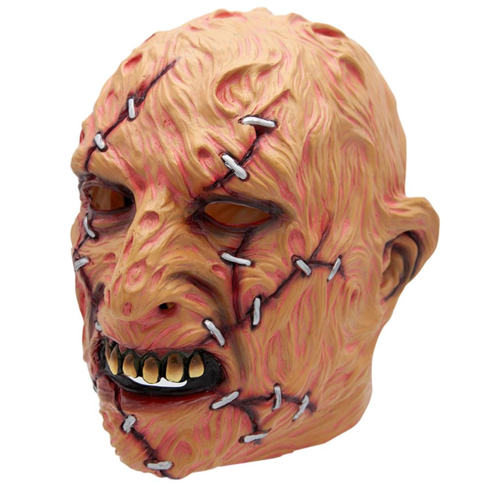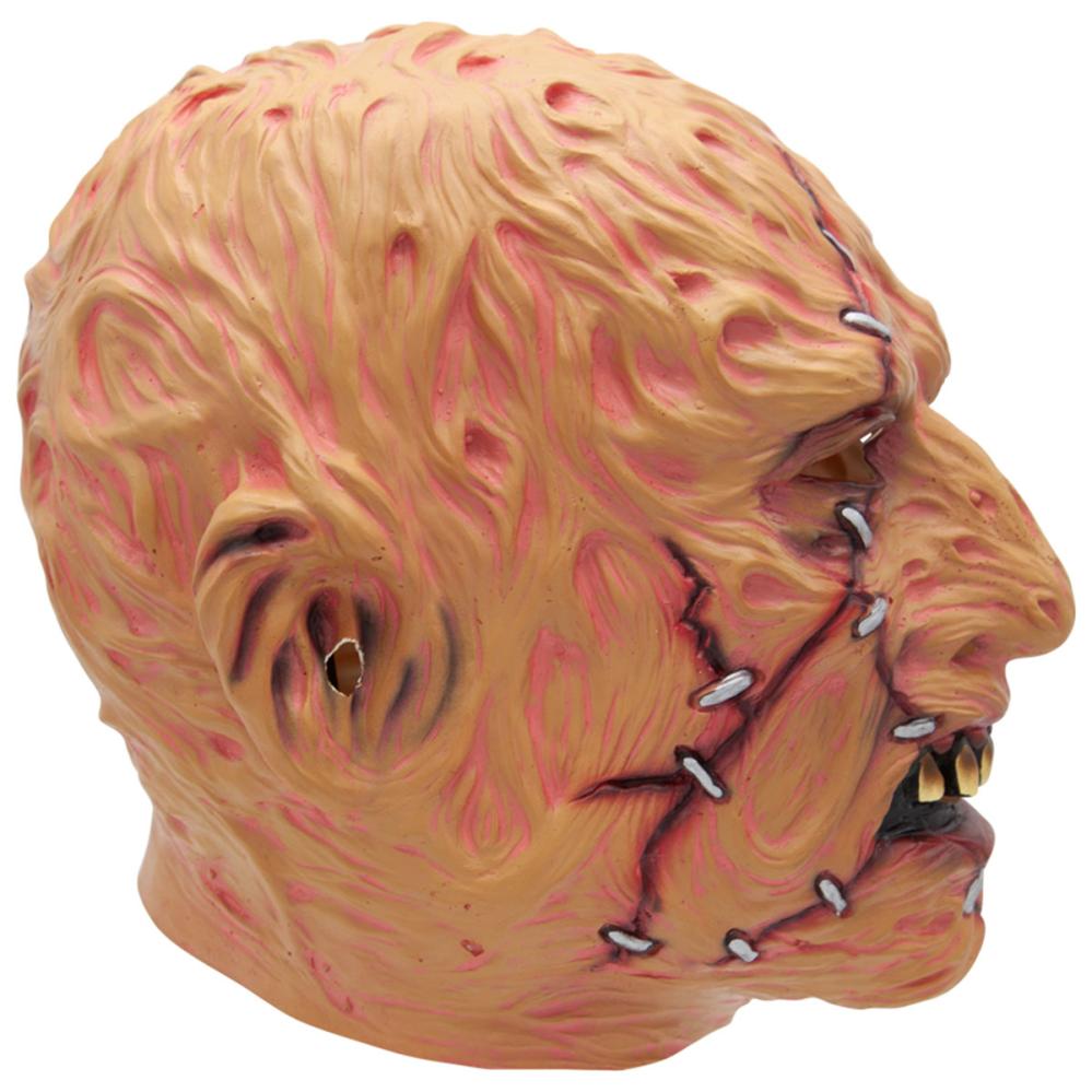Latexmaske med Syede Sår er en beige latexmaske med realistiske syede sår og et smil med gule tænder. Masken har huller til øjne, næse, ører samt mund og dækker både ansigtet og oversiden af hovedet.