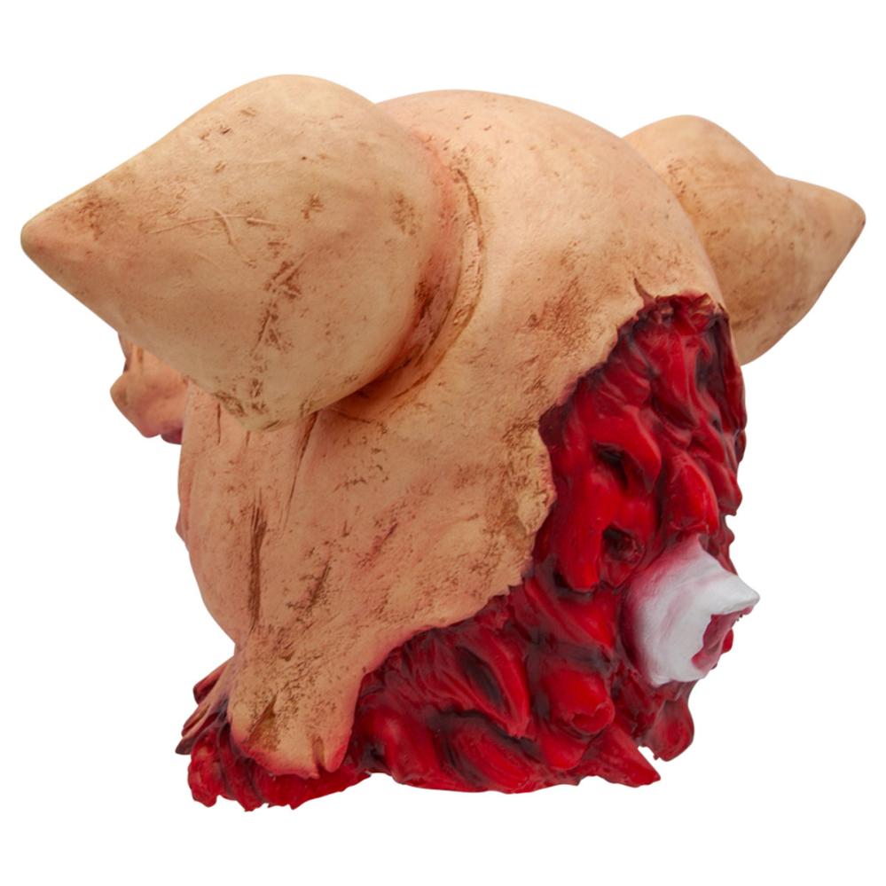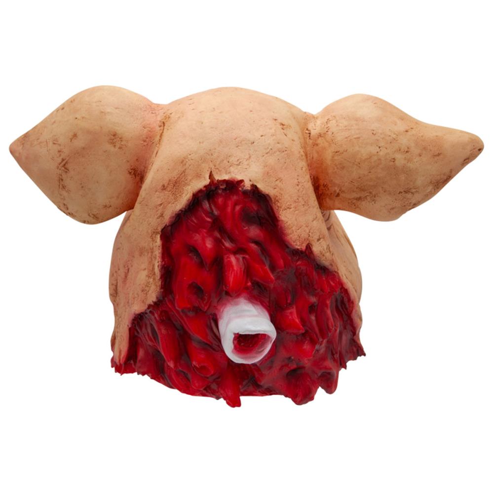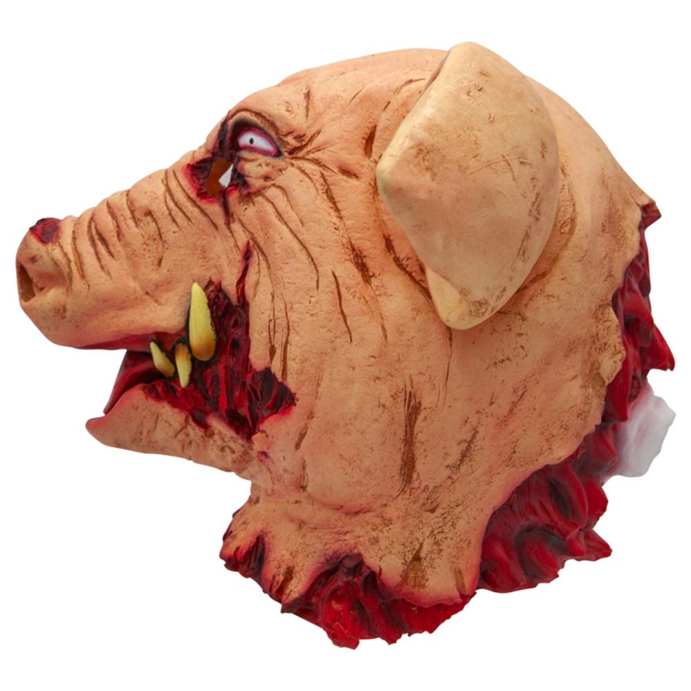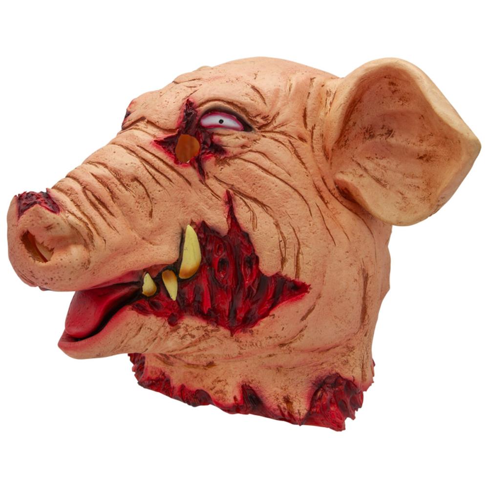 Latexmaske Slagtet Gris er en heldækkende latexmaske som forestiller et slagtet grisehoved med huller til øjne, næse, ører og mund.