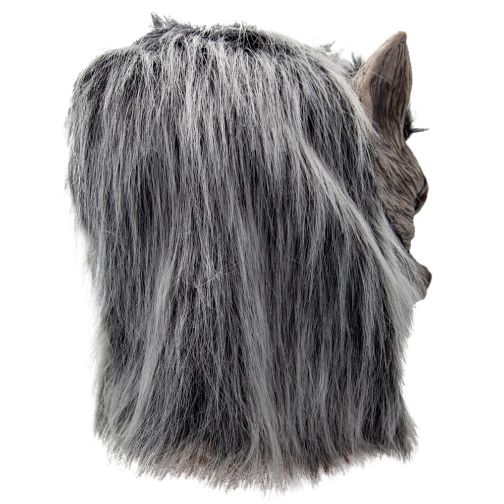 Latexmaske Ulv med Hår er en heldækkende latexmaske, der forestiller et ulvehoved med sort og hvidt hår. Masken har huller til øjne, næse og mund.