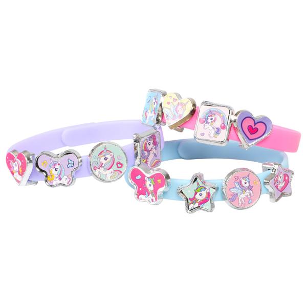 Lav Dine Egne Enhjørnings Armbånd Sæt indeholder et sæt med tre armbånd i blå, lilla og rosa farver samt 18 vedhæng med motiver af enhjørninger, stjerner, hjerter og sommerfugle.