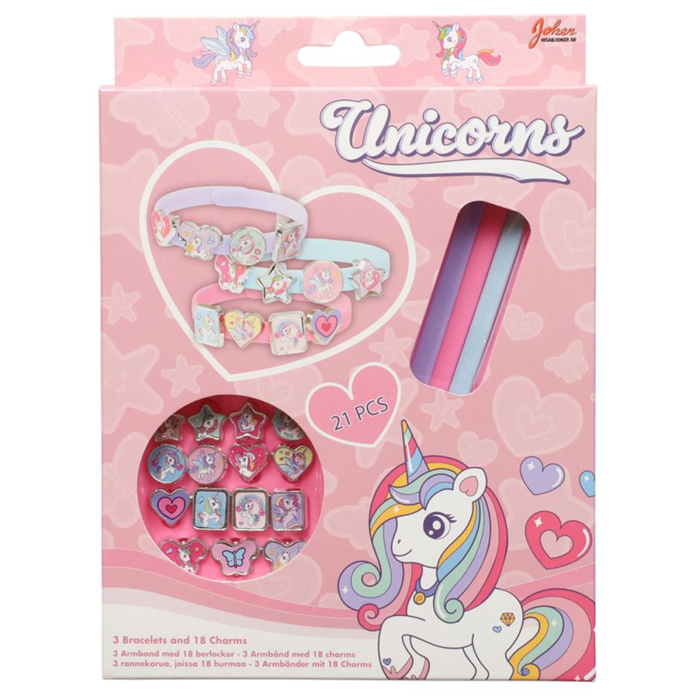 Lav dine egne enhjørnings armbånd med denne sjove hobby sæt! Med dette enhjørnings hobby sæt kan du lave tre forskellige armbånd med fine vedhæng med motiver af enhjørninger, sommerfugle, stjerner og hjerter. Et super sjovt hobby sæt for alle kreative enhjørnings-fans!