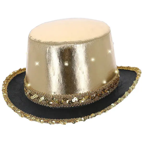 LED Høj Hat Metallisk Guld er en guldhat med en metallisk guld farve, paljet- og glitterdetaljer langs kanten og på båndet samt LED-lys med tre forskellige indstillinger. Batterier til LED-lysene er inkluderet, men kan ikke udskiftes.