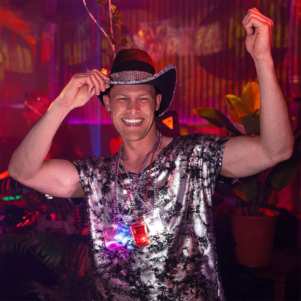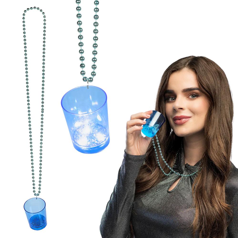 LED Shotglas Halskæde omfatter et shotglas i plast med kuglekæde og tre LED-lamper i bunden. LED Shotglas Halskæde findes i de fire farver blå, hvid, rød eller lyserød.