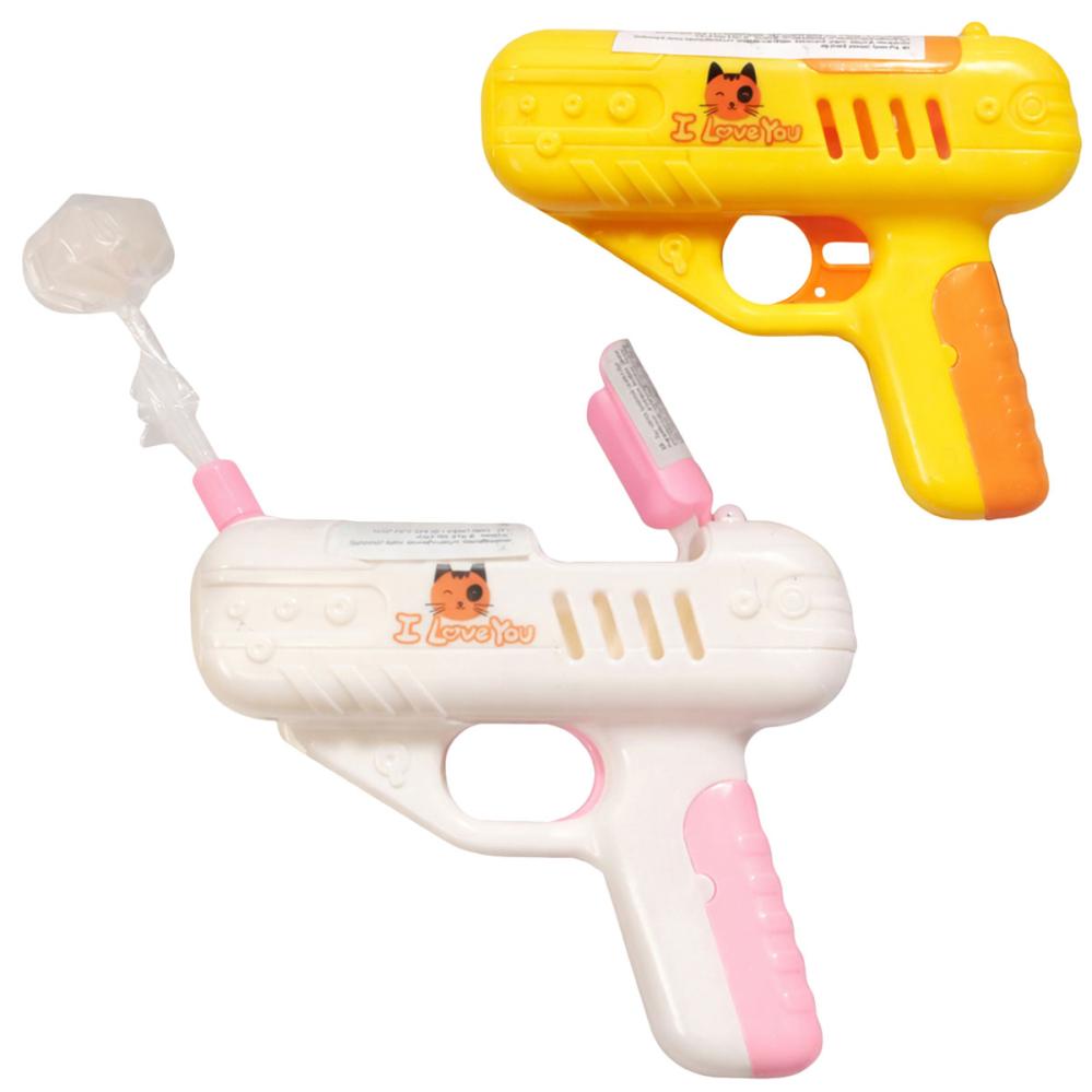 Legetøjspistol med Slikkepind omfatter en legetøjspistol, som skyder en slikkepind ud, når man bruger den. Den er dekoreret med et kattehoved og teksten "I Love You" på begge sider. Fås i farverne hvid med lyserøde detaljer og gul med orange detaljer, hvilken farve du får bliver en sjov overraskelse.