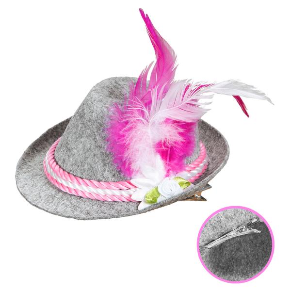 Lille Oktoberfesthat Pink omfatter en lille, grå tyrolerhat med pink-hvide bånd og fjer samt en hvid blomst. Hatten er lavet af polyester og fastgøres på hovedet med en hårnål, der sidder på indersiden. Passer til voksne.