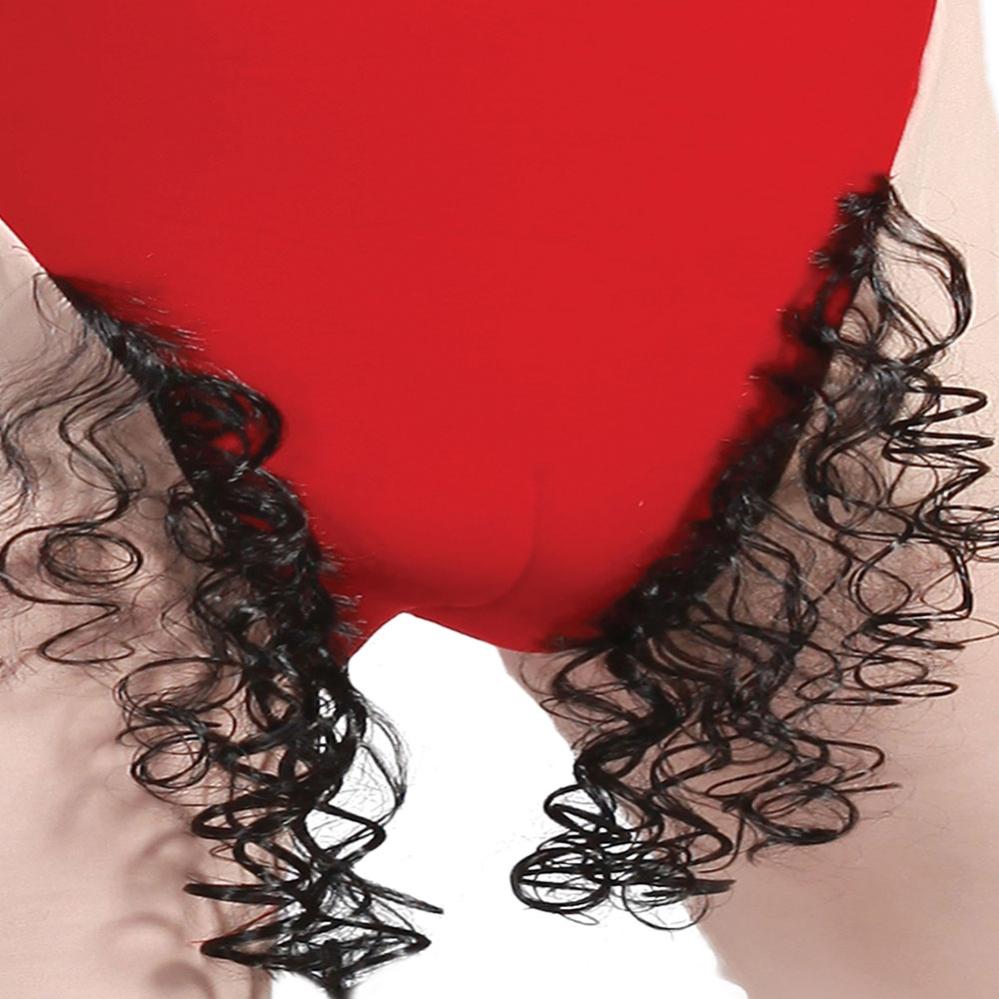 Livredder Baywatch Kostume omfatter et kostume i form af en rød nedringet body med falske bryster og udstående mørkt hår mellem benene. Bodyen har teksten "BRAZILIAN LIFE + GUARD" i hvidt.