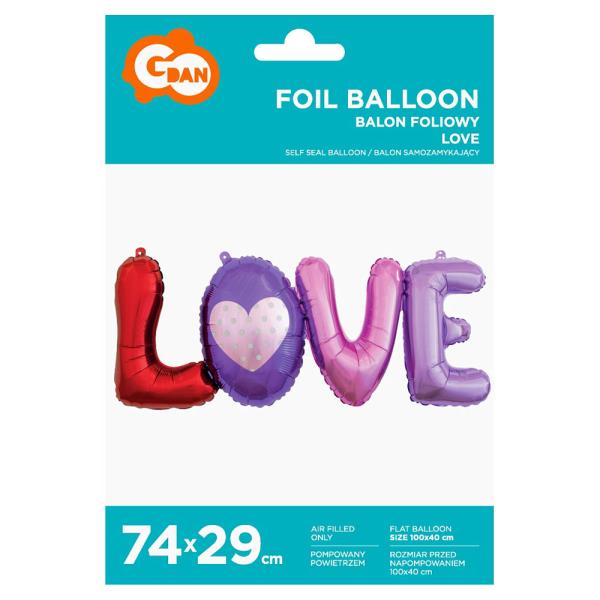 Love Folieballon Rød & Lilla inkluderer en folieballon i form af røde, lilla og pink bogstaver, der danner ordet "Love". Ballonen er ca. 29 cm høj og 74 cm lang. Fyldes med luft.