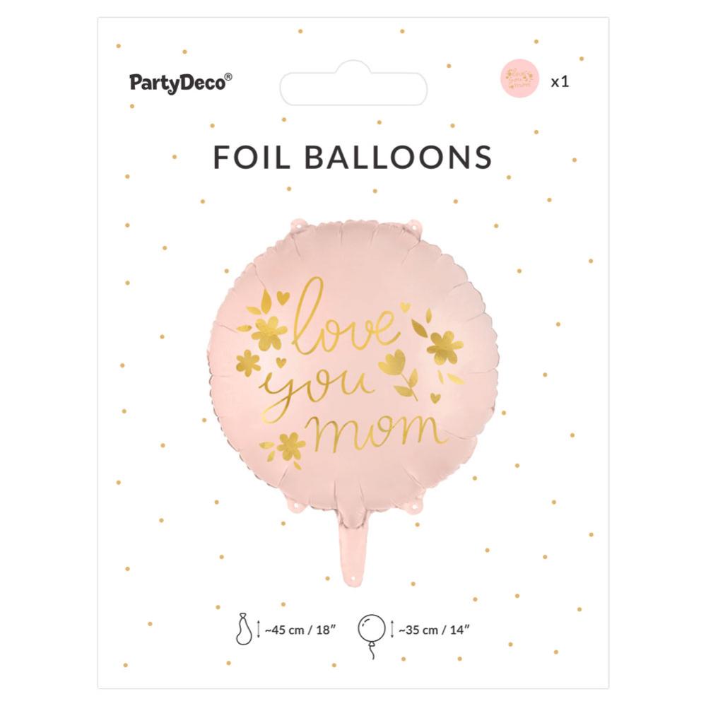 Love You Mom Folieballon omfatter en rund folieballon i lyserød med teksten Love You Mom i snoede bogstaver samt motiver af små blomster i guld. Ballonen kan fyldes med helium eller luft og er cirka 35 cm stor.