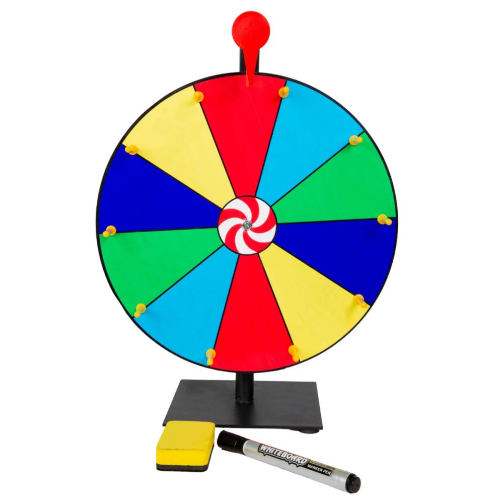 Lykkehjul Flerfarvet 3-pak omfatter tre lykkehjul med tolv felter i rød, blå, grøn, lilla og gul, at skrive eller tegne på med den medfølgende sorte whiteboardtusch og den medfølgende sletteklods.