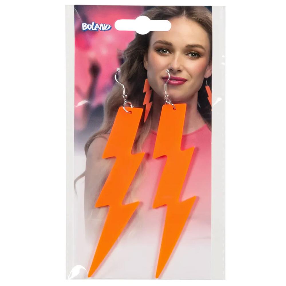De neonøreringene med orange lynmotiv passer til udklædning og er inspireret af 80- og 90'erne. De er lette og behagelige at bære, med sikre kroge og en tydelig farve, der kan ses selv i mørke.