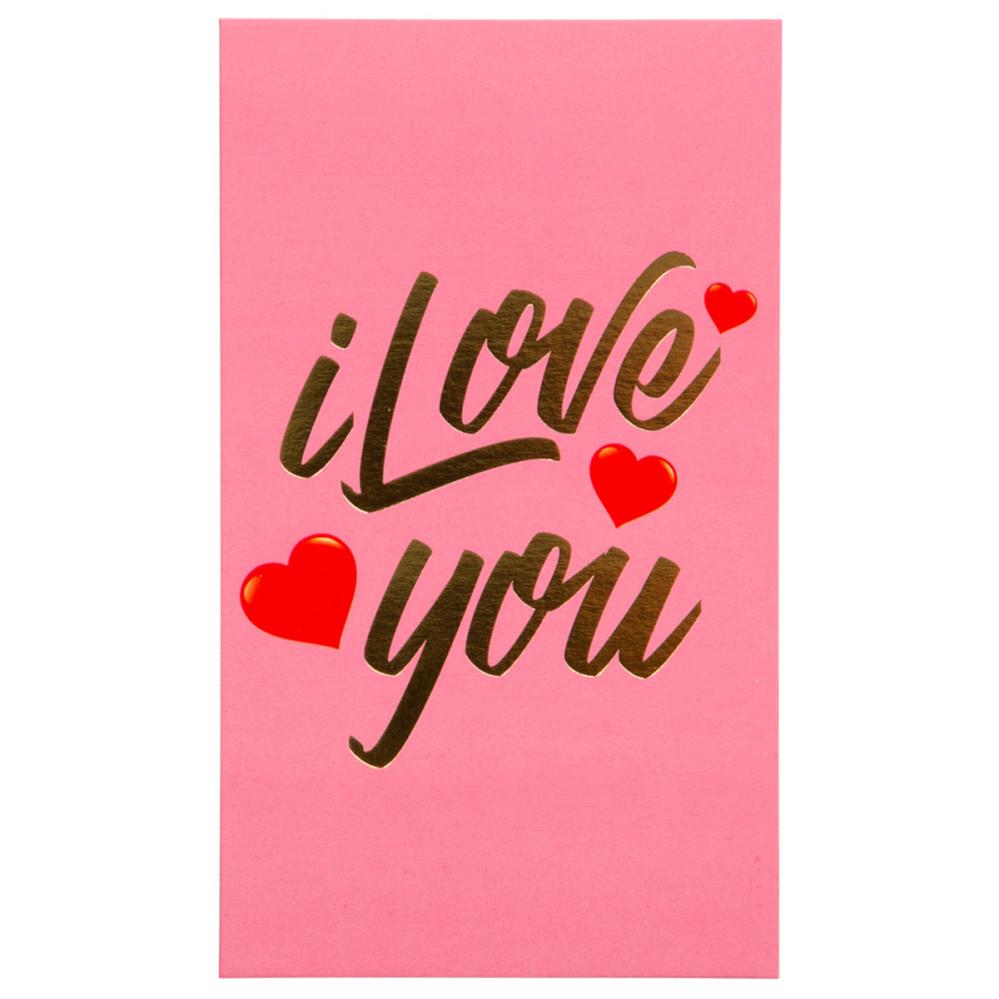 Lyserød Kort med Konvolut I Love You omfatter et lyserødt kort med en hvid konvolut. Kortet er dekoreret med tre røde hjerter og teksten "I love you" i guld.