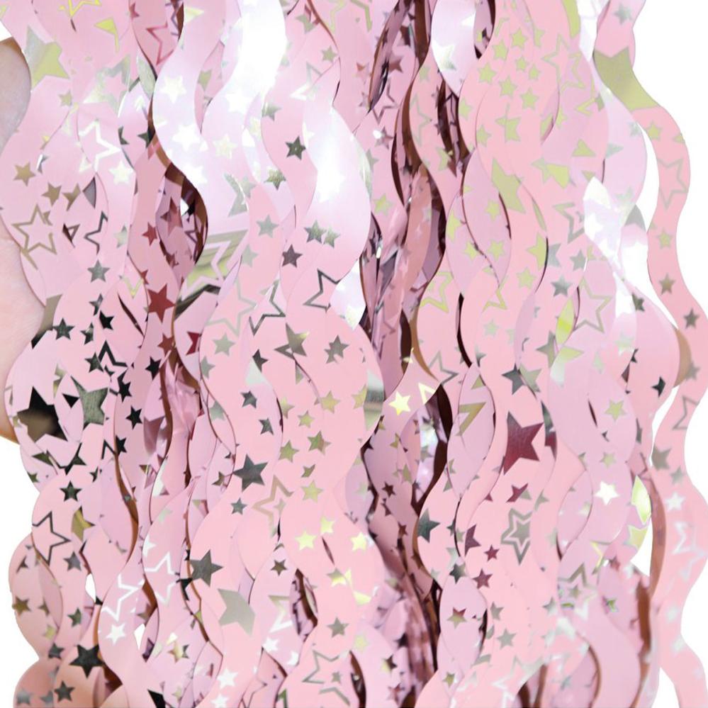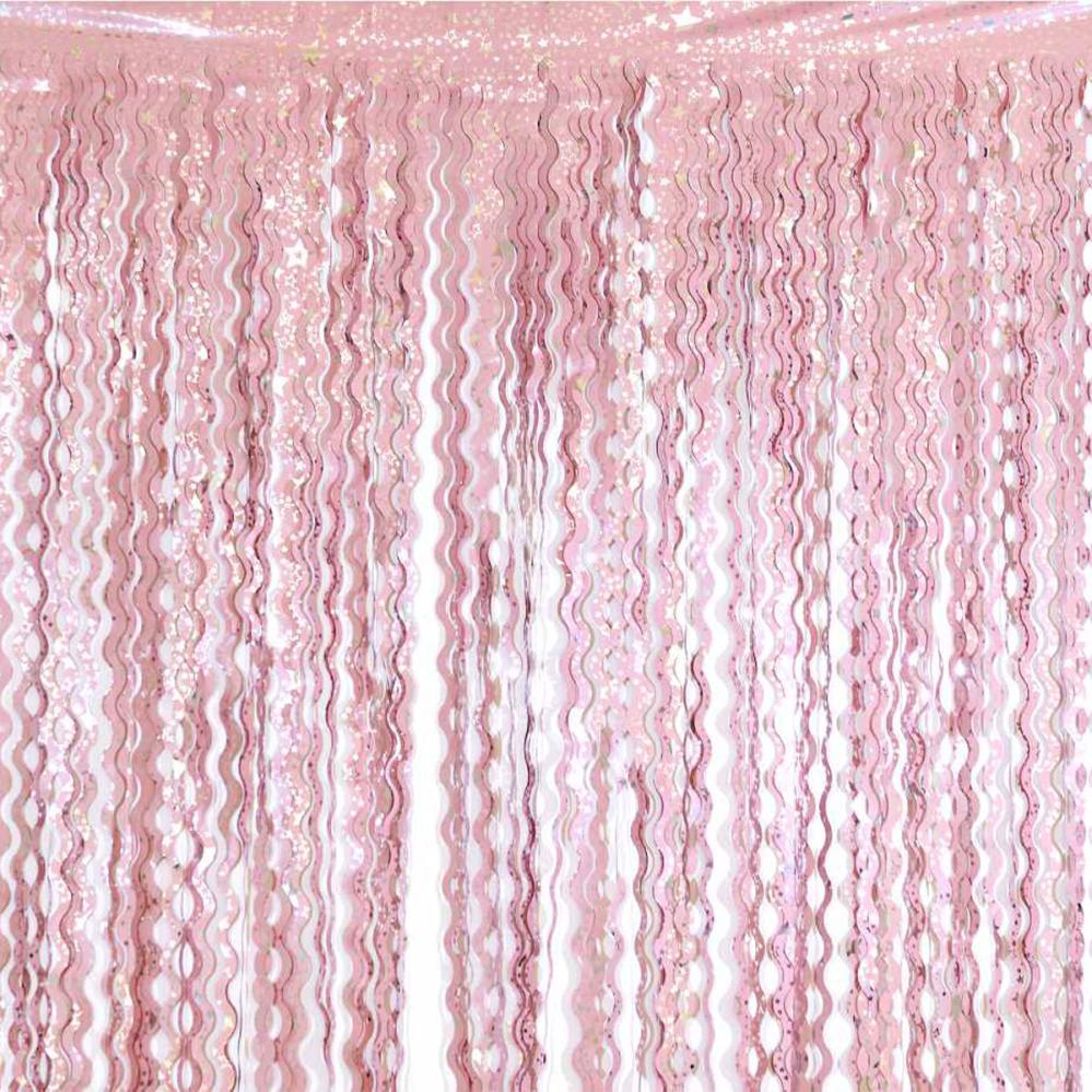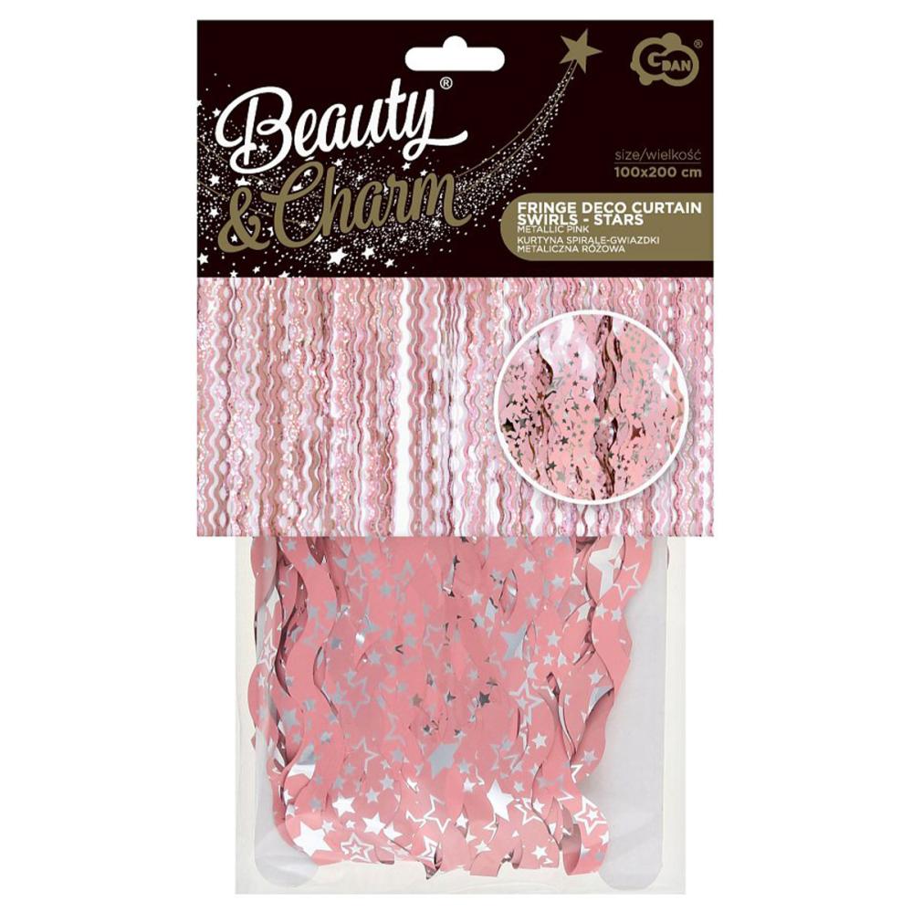 Lyserødt Dørforhæng Swirls med Stjerner omfatter et dørforhæng med lange lyserøde swirls dekoreret med sølvfarvede stjerner.