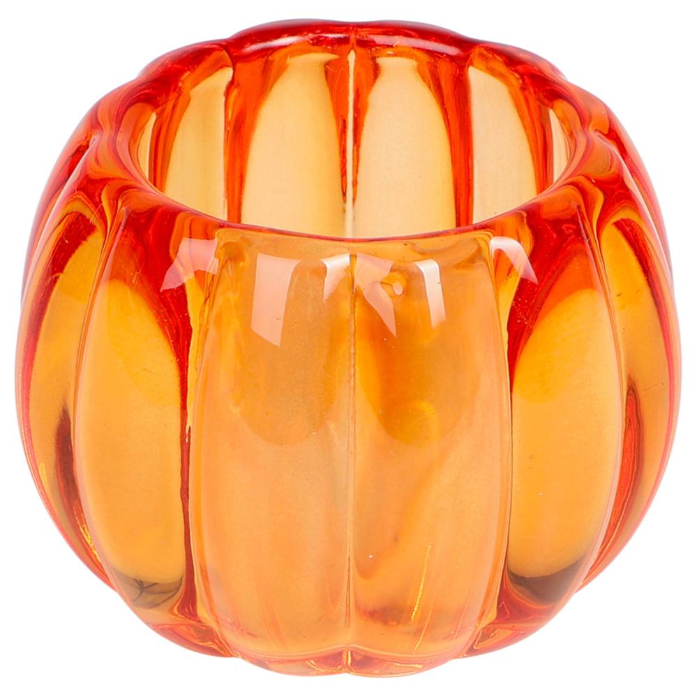 Lysholder Græskar er en lysholder af gennemsigtigt orange glas som er formet som et klassisk græskar og passer til fyrfadslys.