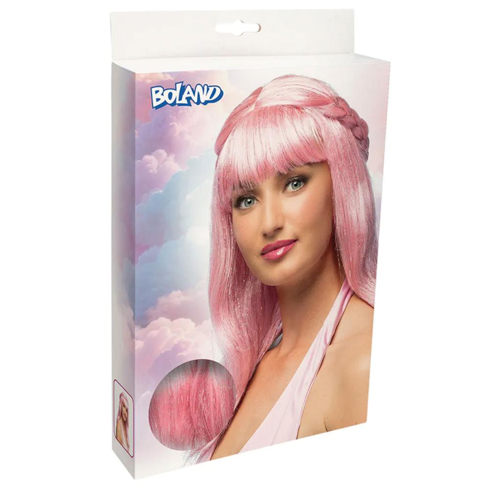 Lysrosa Paryk med Fletninger er en lysrosa, lang og glat paryk med et kort, glat pandehår. Parykken har også to fletninger som mødes på bagsiden samt skimrende tråde som er vævet ind i håret for at give en ekstra glitrende og festlig effekt.