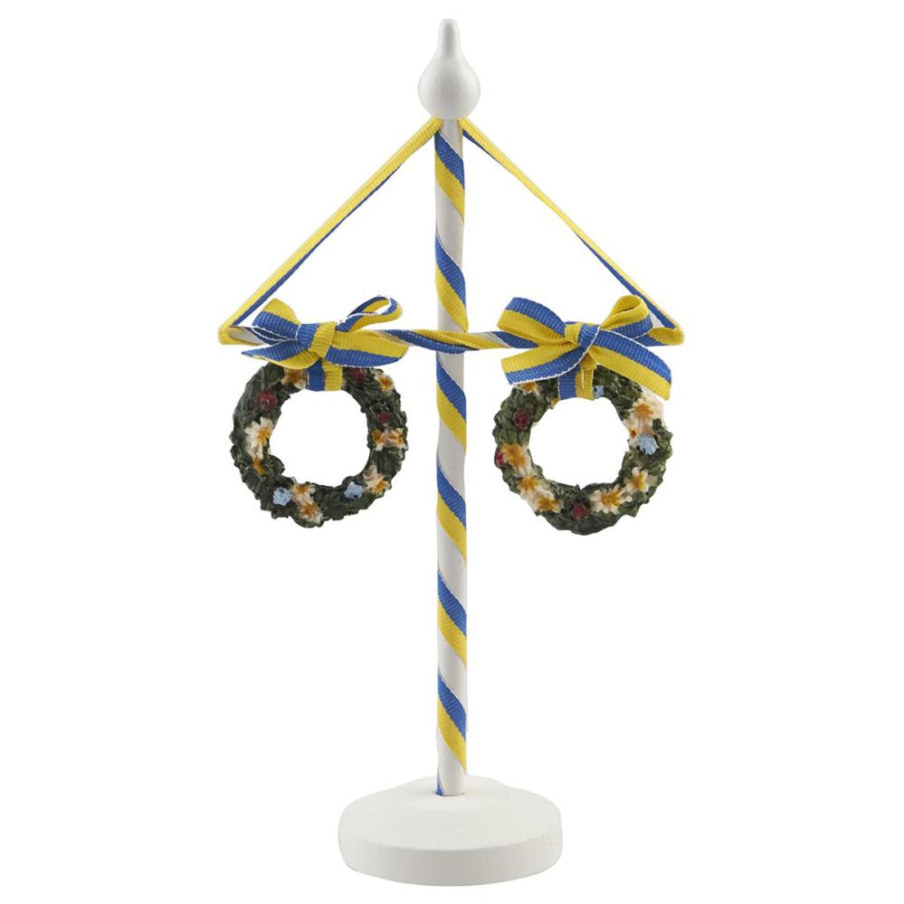 Majstang Træ 25 cm omfatter en hvid majstang i miniature af træ med rund fod, dekoreret med tekstilbånd i blåt og gult og to hængende blomsterkranse.