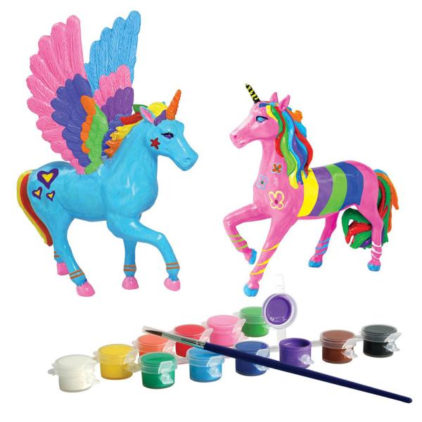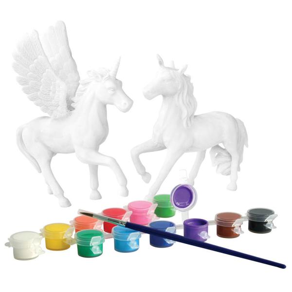 Mal Dine Egne Enhjørninger Sæt omfatter et sæt med to enhjørninger, en med vinger og en uden, 12 forskellige farver og en tynd pensel at male med.