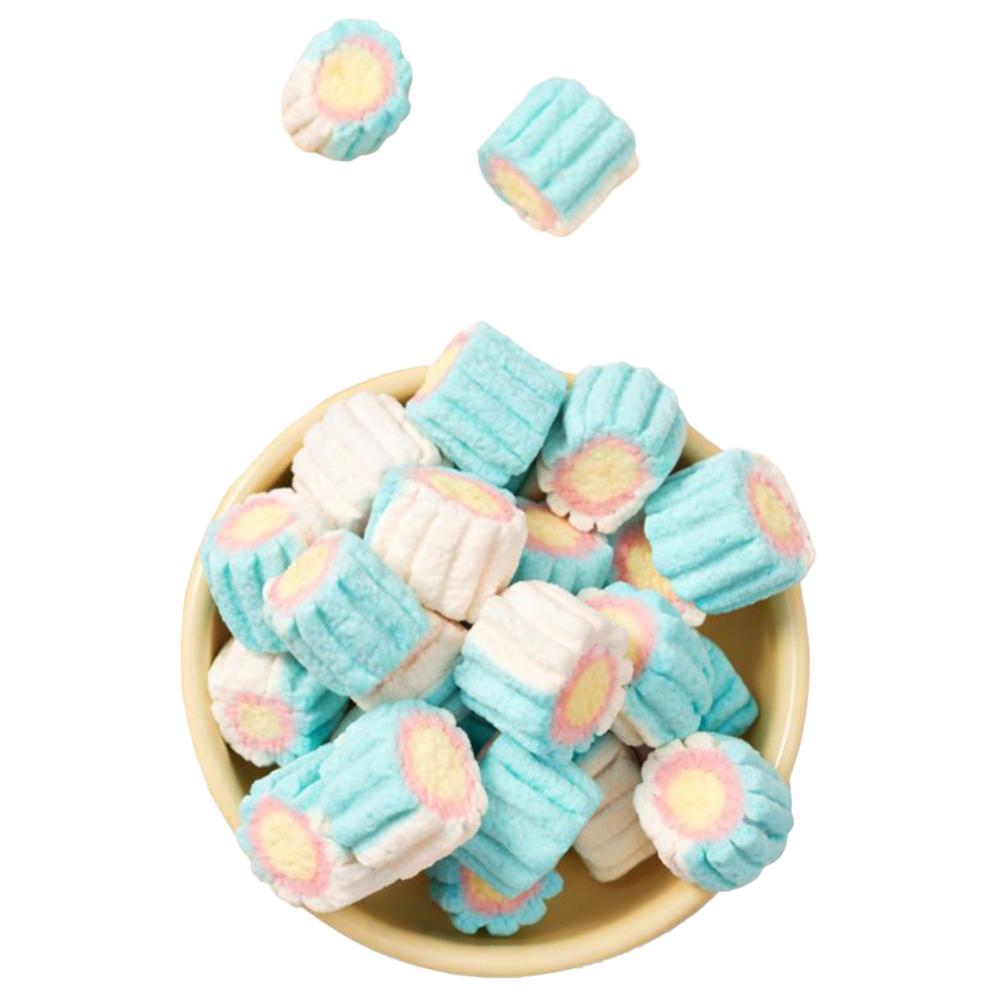 Marshmallows Blå/Hvide Blomster 90g er en pose med 90 gram marshmallows i form af blå og hvide blomster med lyserøde og gule detaljer.