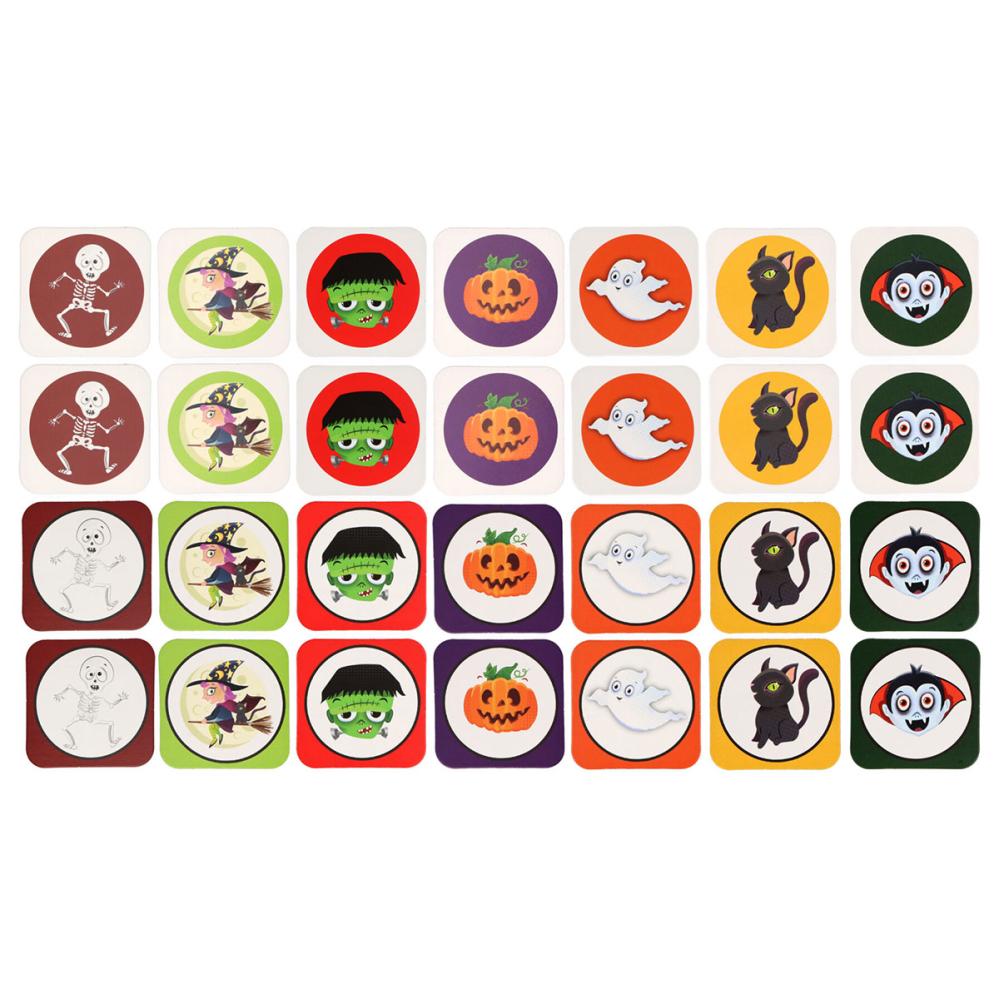 Memospil Halloween 28 Kort omfatter et memoryspil med 28 kort som har sjove halloweenmotiver. Spillet går ud på at spillerne skiftes til at vende to kort ad gangen og forsøge at finde par. Spilleren som finder flest par vinder.