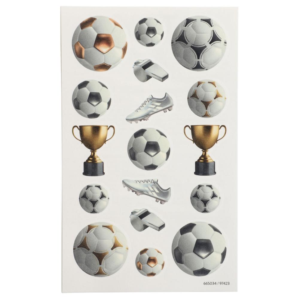 Midlertidige Tatoveringer Fodbold 17-pak består af et ark med 17 stk. midlertidige tatoveringer, som har forskellige fodboldrelaterede motiver.