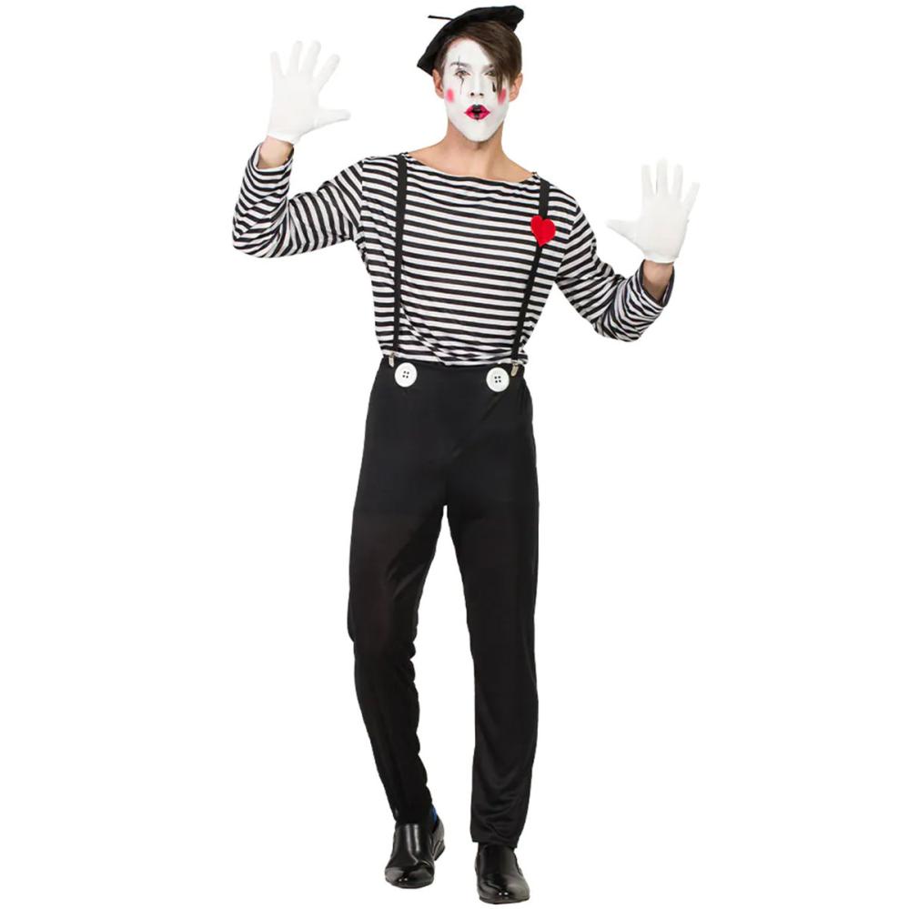 Mimer Kostume omfatter en sort kostume med motiv af en mimekunstner samt en baret, en stribet skjorte i sort og hvid, sorte seler, et skilt formet som et rødt hjerte, et par hvide handsker og et par sorte bukser.