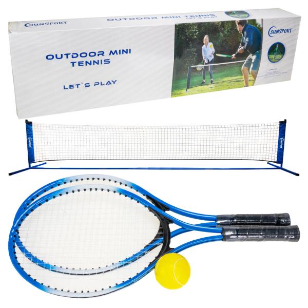Mini Tennis Sæt omfatter et mini-tennissæt med net og stålramme samt to ketsjere og bold. Sættet leveres med praktisk opbevarings- og bæretaske.