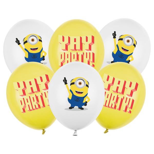Minions Latexballoner Mix 30 cm 6-pak består af seks balloner i to forskellige varianter: hvide balloner med motiv af figuren Mel fra Minions samt gule balloner med teksten "YAY PARTY!" i gult og rødt.