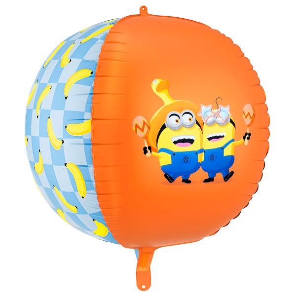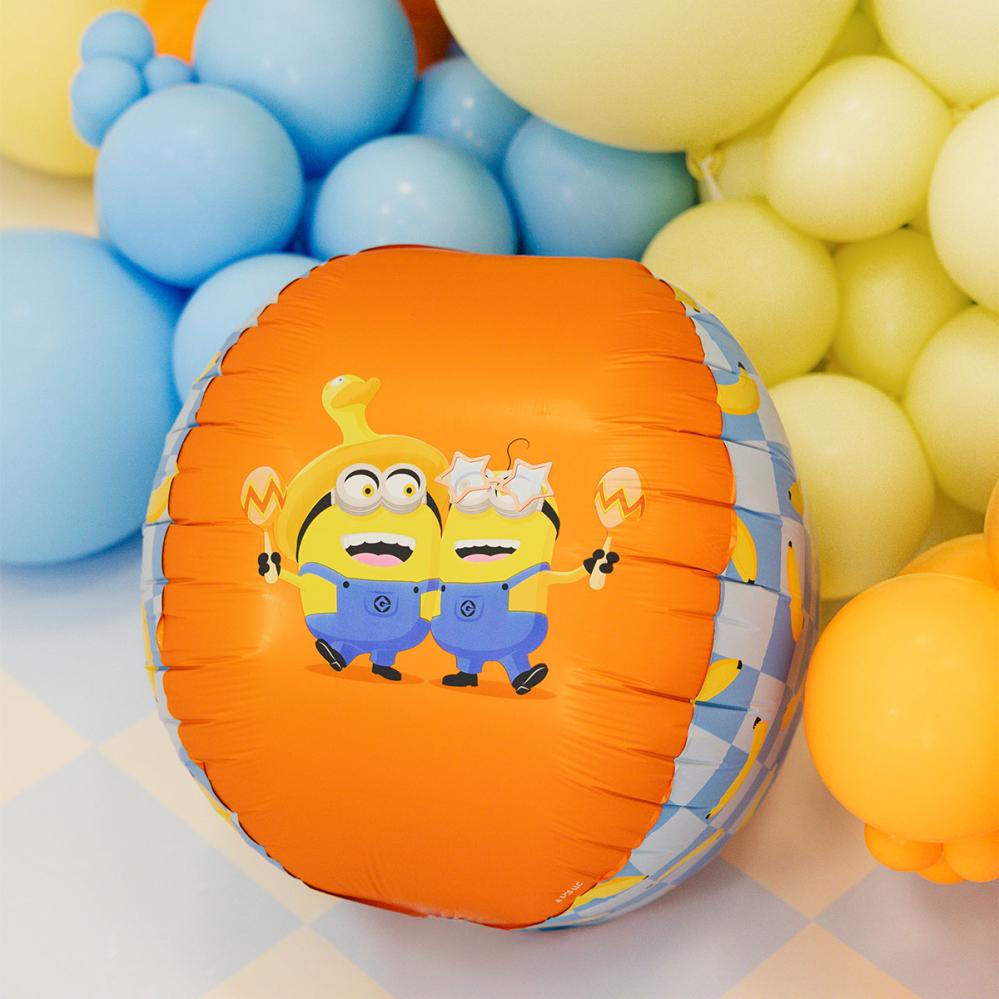 Minions Rund Folieballon 50 cm omfatter en rund folieballon i orange med motiv af to festende Minions samt et blåt ternet område med bananmotiv.