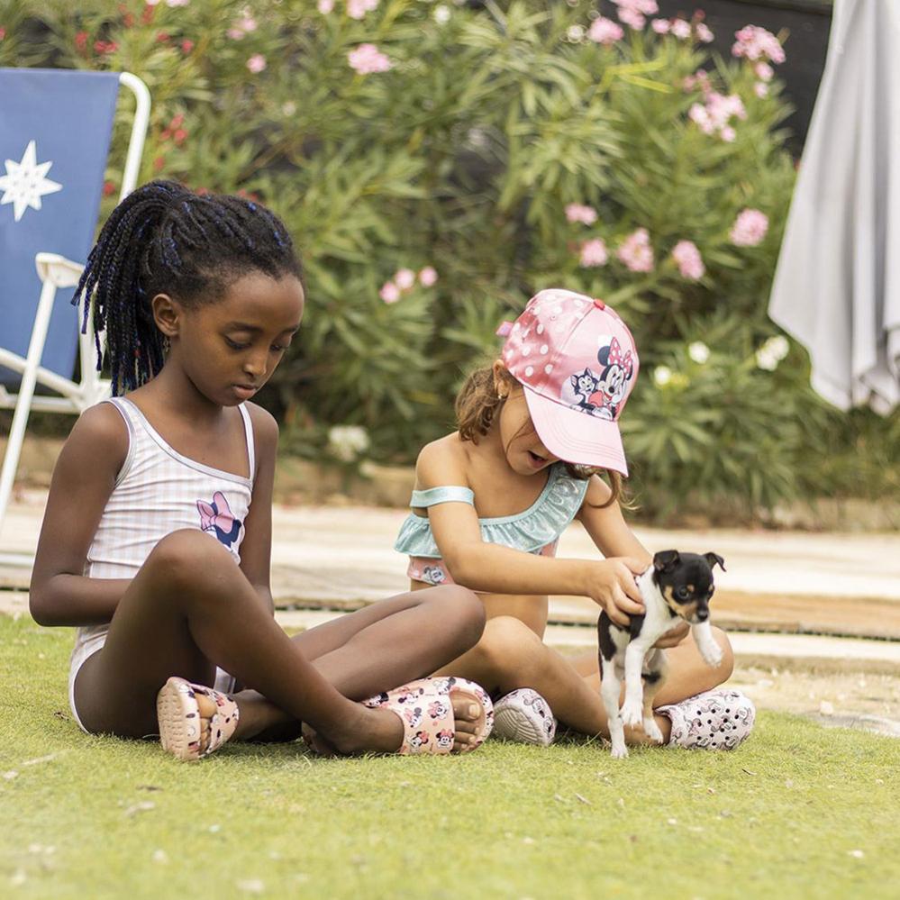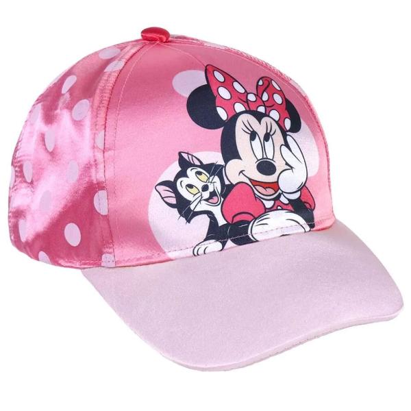 Minnie Mouse Kasket omfatter en rosa kasket med Minnie Mouse motiv og hvide prikker. Kasketten kan justeres med en spænde i velcro.