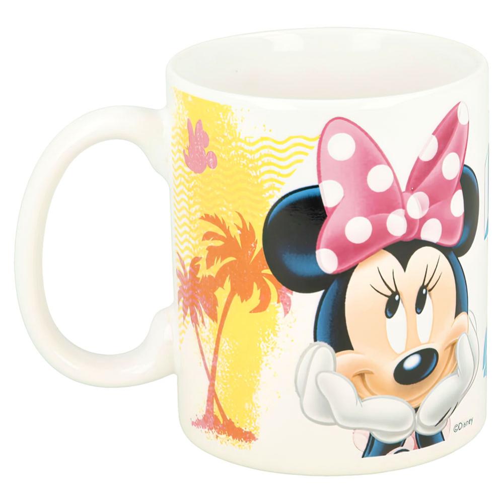 Minnie Mouse Krus Sommer omfatter et keramisk krus med hank og Minnie Mouse motiv og tekst med sommer tema i forskellige farver mod hvid baggrund. Kruset tåler opvaskemaskine og mikroovn, og rummer 325 ml.