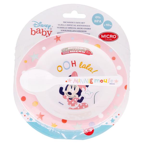 En superfin Minnie Mouse kit med skål og tilhørende ske til babyer og små børn! Dette kit i BPA-fri plast er både flot og praktisk, hvor skålen har små riller, hvor skeen kan lægges på plads. Et perfekt mad sæt i rosa og hvidt med flot Minnie Mouse motiv, hvor både plastikskål og plastikske kan tåle at være i mikroovnen, både behageligt og praktisk, når tiden er knap med baby og børn. Med dyb tallerken og ske a la Minnie Mouse bliver madningen lidt lettere og lidt sjovere for dig, din baby og børn!