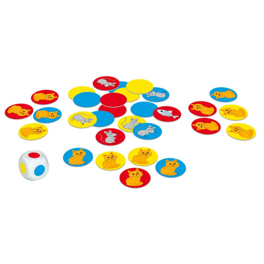 Find kattene i dette spændende Mit Første Spil! Kast terningen og vend en brik med tilsvarende farve, hvis du får en kat, beholder du den, og hvis du får en mus, lader du den ligge med mus-motivet opad. Når der kun er mus tilbage på bordet, er spillet slut, og den, der har samlet flest katte, har vundet. Dette er et sjovt selskabsspil for børn, der byder på meget glæde, spænding og som også lader barnet træne sin observationsfærdighed. Passende børnespil til alle over 3 år.