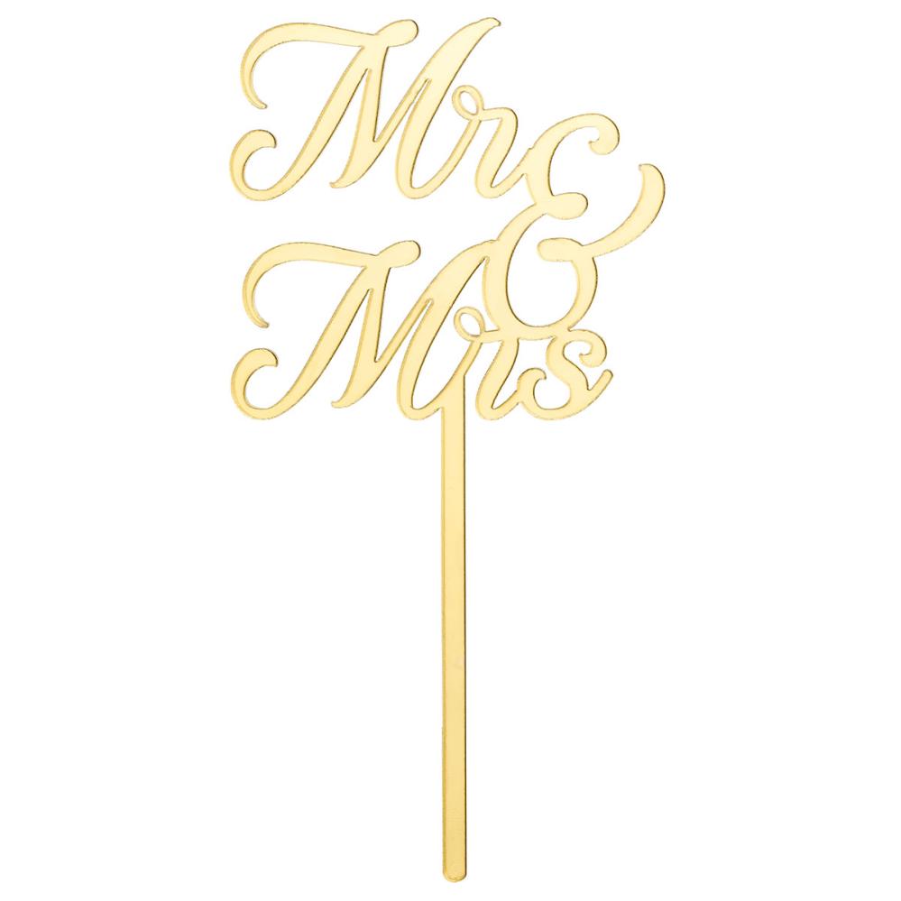 Mr & Mrs Cake Topper Guld omfatter en gylden kagedekoration, som danner teksten 'Mr & Mrs'. OBS: Dekorationen er forsynet med en beskyttelsesfilm, som fjernes før brug.