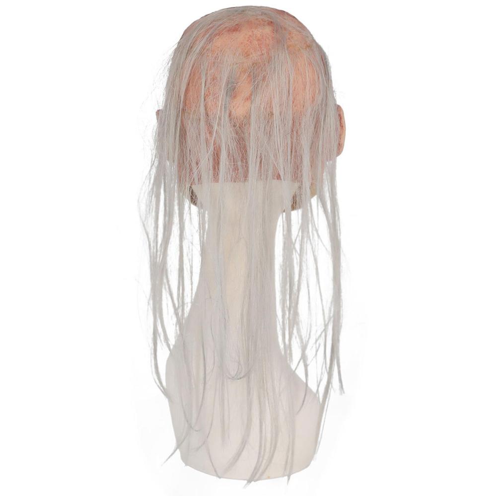 Nightmare Smile Latexmaske er en helmaske med stirrende øjne, spidse tænder, gammel knudret hud og pjusket hvidt hår. Masken dækker hele hovedet og har små huller til øjne, næse og ører.
