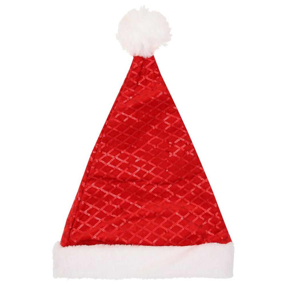 Nissehue Rød med Pailletter omfatter en rød nissehue med hvid pelsskant og røde pailletter.