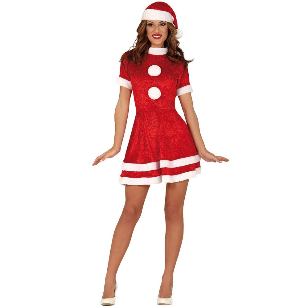 Nissemor Julekjole med Nissehue omfatter en rød og hvid kort nissekjole i plys, som er dekoreret med to hvide bolde og har korte ærmer. Til dragten medfølger også en matchende nissehue.
