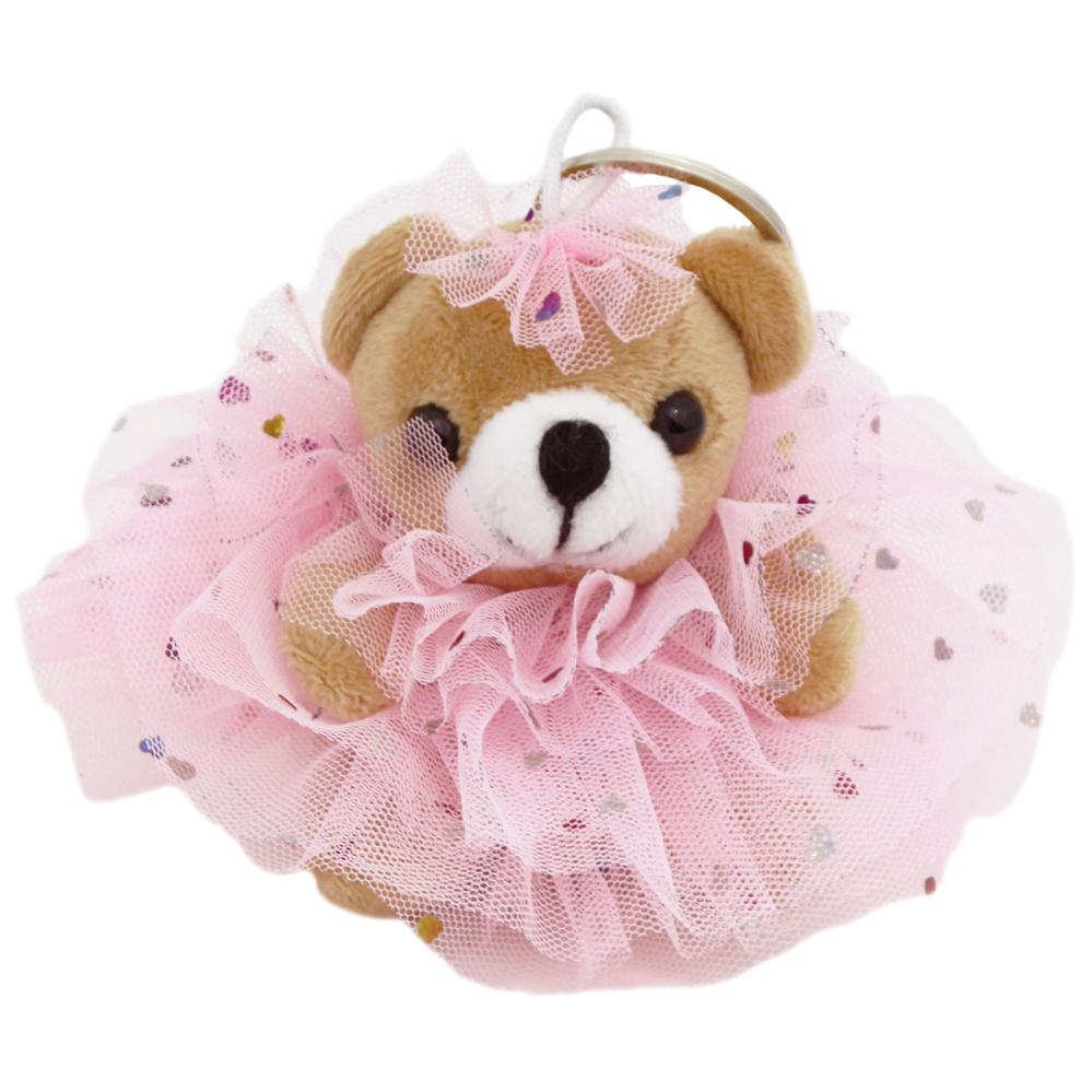 Nøglering Bjørn med Lyserød Nederdel 9 cm omfatter en nøglering med en lille lysebrun og hvid bjørn, som bærer et lyserødt tylskørt prydet med små glitrende paillettehjerter.