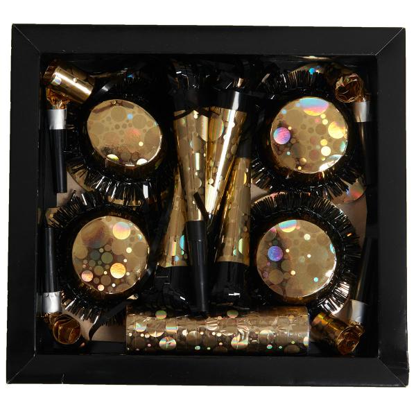 Nytårssæt i Guld til 4 Personer omfatter festartikler til fire personer i sort og guld med prikker, der skinner i regnbuens farver. Sættet indeholder fire små hatte, fire truthorn, fire slangepustere og serpentiner.