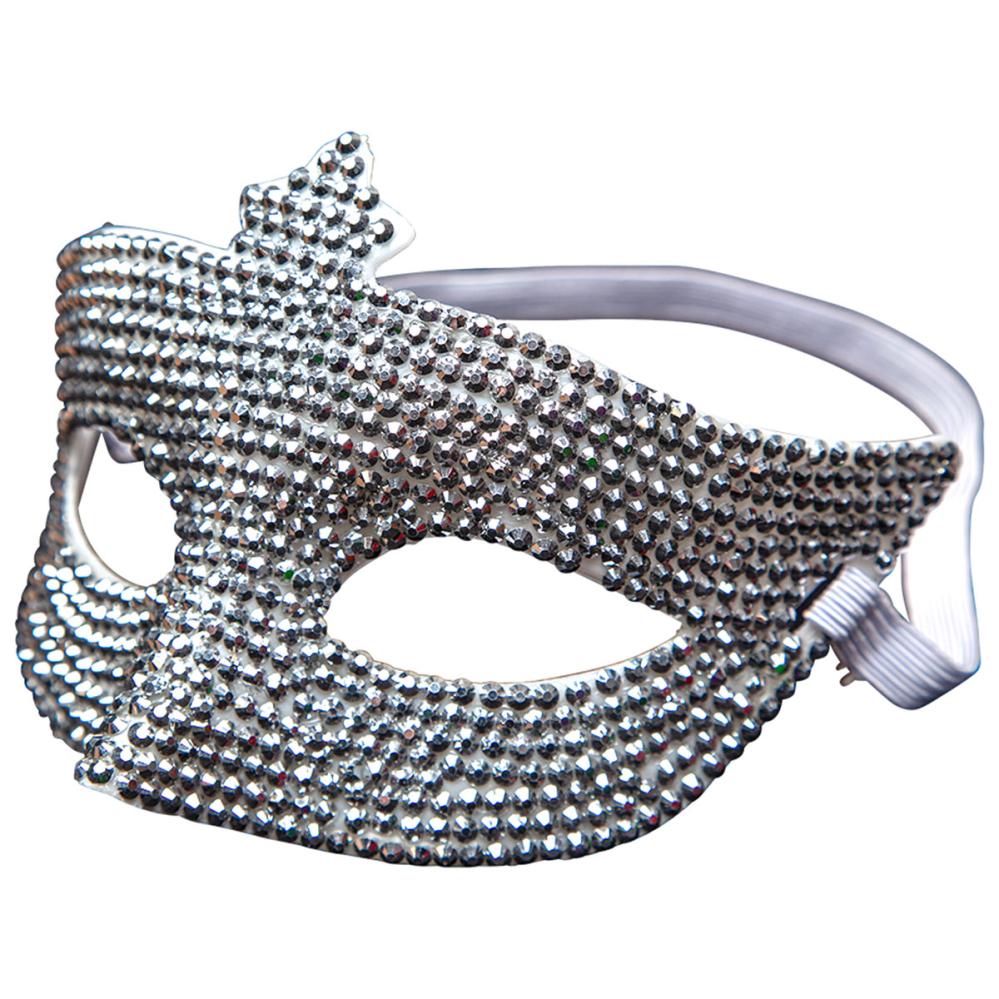 Øjenmaske med Rhinsten omfatter en hvid øjenmaske lavet i hård plast som er dekoreret med små sølvfarvede plastdiamanter og har huller til øjnene. Masken holdes på plads ved hjælp af et sort elastisk bånd.
