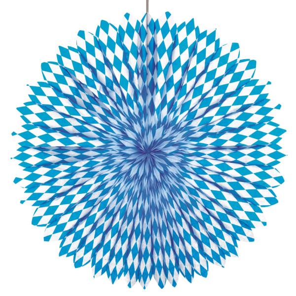 Oktoberfest Dekoration Sløjfe Bayern Blå omfatter en hængende dekorativ solfjeder i et ternede bayersk mønster.