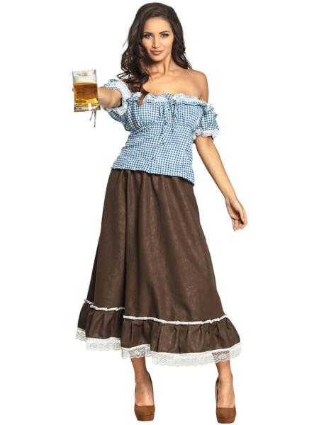 Oktoberfest Frau Muller Kostume omfatter en blå-hvid ternede bluse med dekorative blonde detaljer samt en brun nederdel med blonde detaljer langs kanten. Kostumet er lavet af polyester.