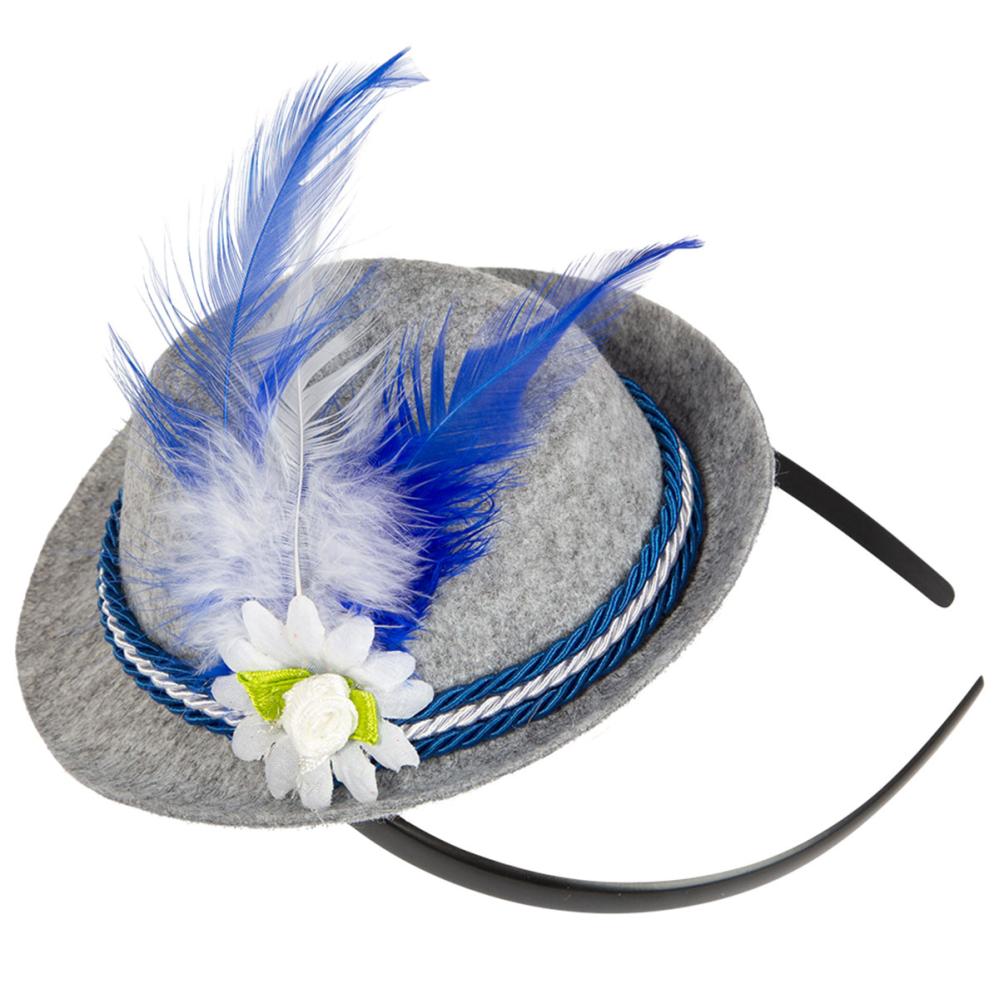 Oktoberfest Hårbøjle med Tyrolerhat Grå omfatter en sort hårbøjle med en fremtrædende grå tyrolerhat, dekoreret med tre snore i blå og hvid, fjer i matchende farver samt en hvid blomst.