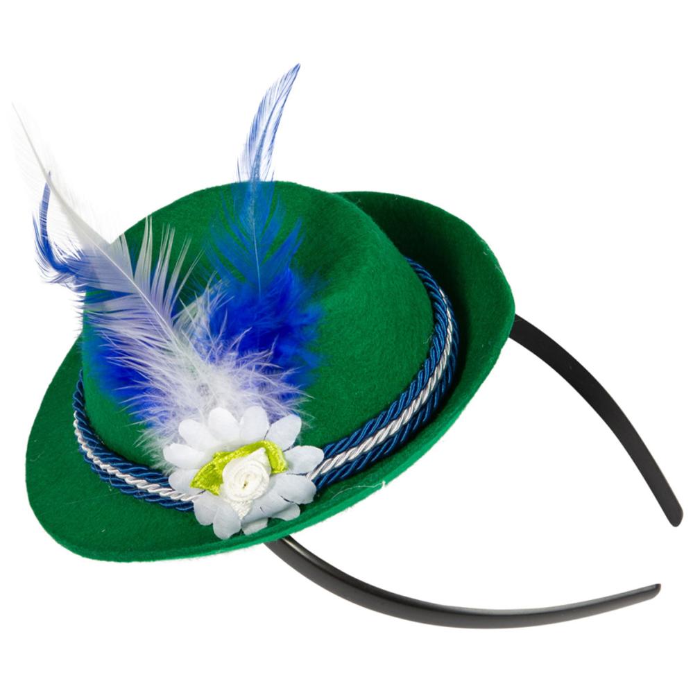 Oktoberfest Hårbøjle med Tyrolerhat Mørkegrøn omfatter en sort hårbøjle med en udstående mørkegrøn tyrolerhat, dekoreret med tre snore i blå og hvid, fjer i matchende farver samt en hvid blomst.