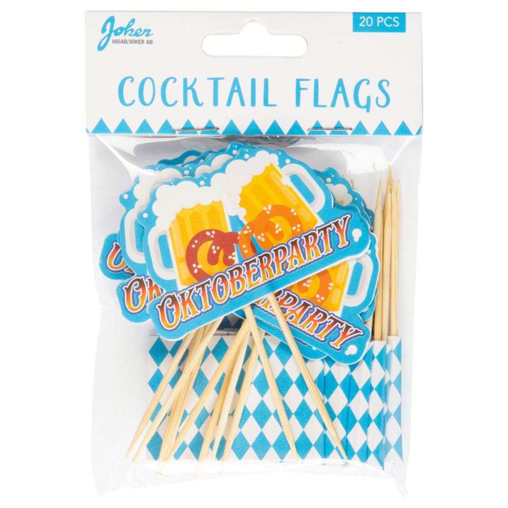 Oktoberfest Party Picks 20-pak indeholder tyve træpinde hvoraf ti har bayerske flag og ti har skilte som er dekoreret med ølkrus, kringler samt teksten "OKTOBERPARTY".