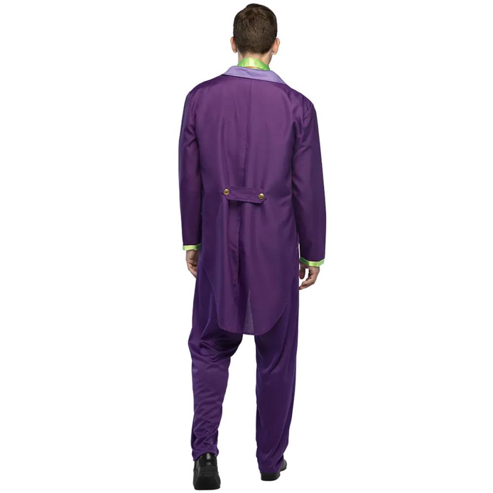 Ondskabsfuldt Geni Kostume omfatter et kostume inspireret af Joker med en rød butterfly, en grøn krave, en grøn vest, et par lilla bukser og en matchende jakke.